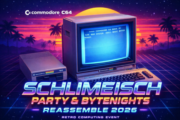 Kompilace pod názvem SCHLIMEISCH PARTY & BYTENIGHTS — REASSEMBLE 2026 bude 24.-26.4. netradičně v blízkosti Prahy v Úhonicích, v pěkně zrestaurované Obecní Stodole, která je na podobné akce, věřím, dobře stavěná. Tedy jestli párty opravdu bude, záleží hlavně na vás...